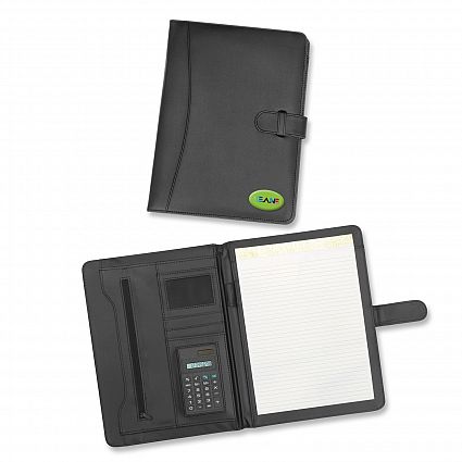 Large luxury P.U. portfolio with a calculator, a lined pad, a pen loop, pockets for business cards and a secure closure strap. It laser engraves to a matt brown finish.