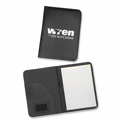 Large P.U. portfolio with a lined pad and a pen loop. It laser engraves to a matt brown finish.