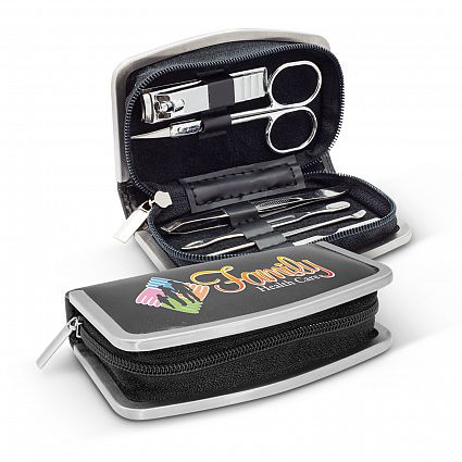 Six-piece manicure set in an attractive zippered PU case with matt chrome trim.